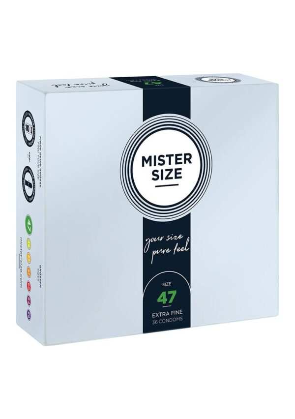 Pure Feel – Condoms 47 mm – 36 PackHet voelt pas goed als het goed zit! Denk er eens over na: alles wat u op uw lichaam aantrekt – van handschoenen tot hoeden tot jassen – is perfect ontworpen voor uw maat. En nu is je condoom dat ook. Met een op maat gemaakt MISTER SIZE condoom voel je alles en ben je nergens bang voor! Condoommaat, perfect passende condooms – daar denken of praten we niet echt over. Heel vaak weten mannen niet echt wat hun juiste condoommaat is. Ook wordt er niet veel hulp aangeboden in de markt om mannen te informeren over hun juiste condoommaat. Het omdoen van de verkeerde condoommaat kan slippen, breken, een dof gevoel en vooral een gebrek aan plezier veroorzaken. Bovendien varieren condooms die momenteel op de markt verkrijgbaar zijn aanzienlijk in textuur, smaak en vorm. Maar ze fluctueren nauwelijks in grootte. Condoommaat wordt niet echt genoemd, misschien omdat de breedte varieert tussen 52 56 mm. Er zijn maar heel weinig condooms verkrijgbaar in maat 57 mm, een condoommaat die al als erg groot wordt beschouwd. Als we echter kijken naar recente onderzoeken naar penisgrootte in erectie, bleken breedten van 58 – 61 mm eigenlijk de gemiddelde maten te zijn. MISTER SIZE -7 condoommaten voor een perfecte pasvorm! Meer comfort, veiligheid en gevoel!