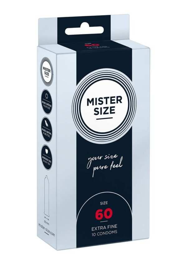 Pure Feel – Condoms 60 mm – 10 PackHet voelt pas goed als het goed zit! Denk er eens over na: alles wat u op uw lichaam aantrekt – van handschoenen tot hoeden tot jassen – is perfect ontworpen voor uw maat. En nu is je condoom dat ook. Met een op maat gemaakt MISTER SIZE condoom voel je alles en ben je nergens bang voor! Condoommaat, perfect passende condooms – daar denken of praten we niet echt over. Heel vaak weten mannen niet echt wat hun juiste condoommaat is. Ook wordt er niet veel hulp aangeboden in de markt om mannen te informeren over hun juiste condoommaat. Het omdoen van de verkeerde condoommaat kan slippen, breken, een dof gevoel en vooral een gebrek aan plezier veroorzaken. Bovendien varieren condooms die momenteel op de markt verkrijgbaar zijn aanzienlijk in textuur, smaak en vorm. Maar ze fluctueren nauwelijks in grootte. Condoommaat wordt niet echt genoemd, misschien omdat de breedte varieert tussen 52 56 mm. Er zijn maar heel weinig condooms verkrijgbaar in maat 57 mm, een condoommaat die al als erg groot wordt beschouwd. Als we echter kijken naar recente onderzoeken naar penisgrootte in erectie, bleken breedten van 58 – 61 mm eigenlijk de gemiddelde maten te zijn. MISTER SIZE -7 condoommaten voor een perfecte pasvorm! Meer comfort, veiligheid en gevoel!