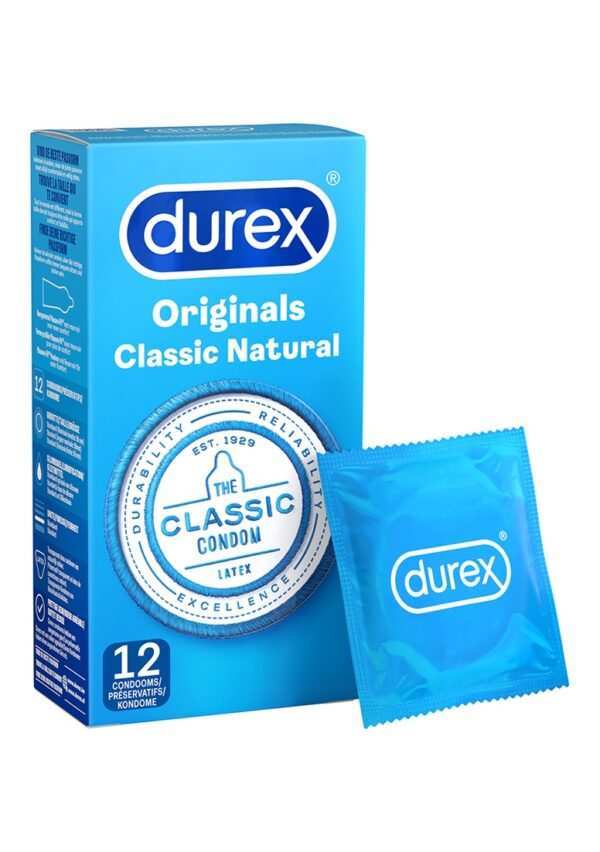 Originals Classic Natural – Condoms – 12 PiecesIedereen is anders, maar de juiste pasvorm moet altijd comfortabel en veilig zijn. Durex Originals Classic Natural condooms zijn de originele Durex condooms, betrouwbaar als altijd. De condooms zijn gemaakt van transparant natuurrubberlatex en hebben een lekkere geur. Pleasure -FitTM-pasvorm met reservoir is speciaal ontworpen voor meer comfort. Geen enkele vorm van anticonceptie biedt 100 betrouwbare bescherming tegen zwangerschap, hiv (aids) of andere seksueel overdraagbare aandoeningen. Lees de instructies aan de binnenkant van de verpakking goed door, vooral als u het condoom gebruikt voor anale orale seks.