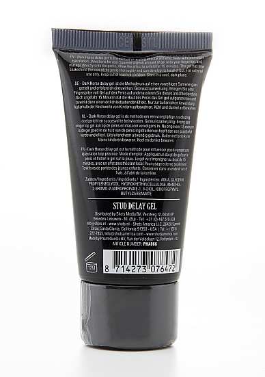 Dark Horse – Delay Gel – 2 fl oz / 50 mlDark Horse delay gel is de methode om een vroegtijdige zaadlozingdoelgericht en succesvol te beinvloeden. Gebruiksaanwijzing: Breng een vingertop gel aan op de penis en masseer vervolgens in. Na ongeveer 15 minuten is de gel goed in de huid van de penis ingetrokken en heeft dan een plaatselijk verdovend effect. Uitsluitend voor uitwendig gebruik. Buiten het bereik van kleine kinderen bewaren. Koel en donker bewaren.
