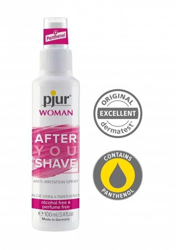 Woman After You Shave – After Shave for Women – 3 fl oz / 100 mlDe After Shave voor vrouwen! Puistjes en een jeukende huid na het scheren van de intieme zone? Dat is helemaal niet nodig: het aanwezige panthenol verhoogt de vochtigheid van de huid, werkt regenererend en ontstekingsremmend en bevordert de productie van nieuwe huidcellen. Zodoende wordt de gestreste huid geregenereerd. De After Shave is 100 parfum- en alcoholvrij. Daarom brandt het niet, maar heeft een zacht verzorgend effect op de huid. Pjur WOMAN After YOU Shave is smaak- en geurneutraal en natuurlijk dermatologisch getest. Gewoon scheren aanbrengen genieten!