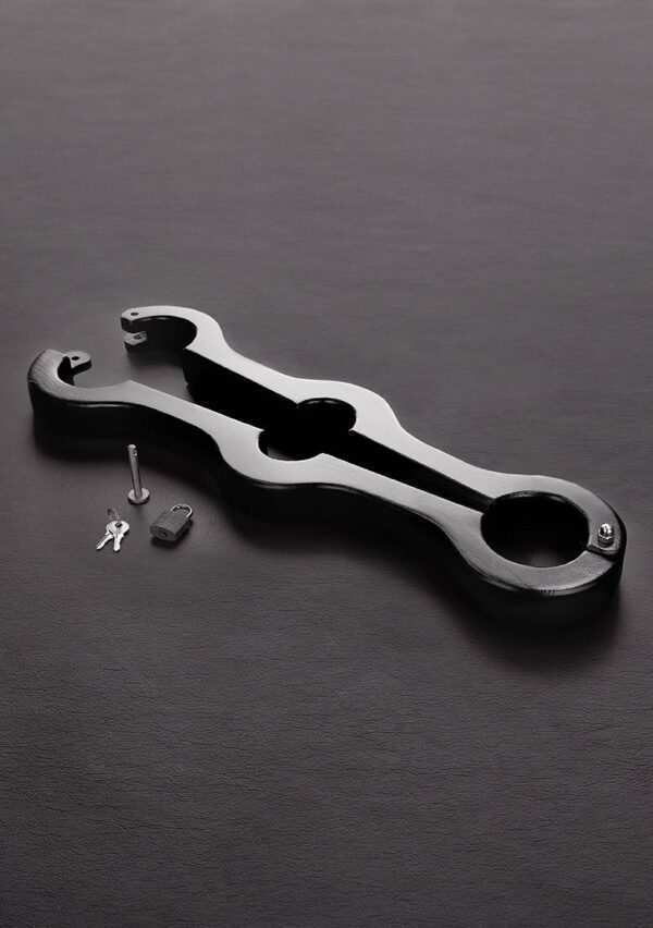 Genitals to Arms PillorySchattige femdom vernederende schandpaal voor brute koppeling van handen aan mannelijke genitaliën (penis plus scrotum). Uniek Lederhalt’s ontwerp, gespleten verbinding en bevestiging met enkele pin.