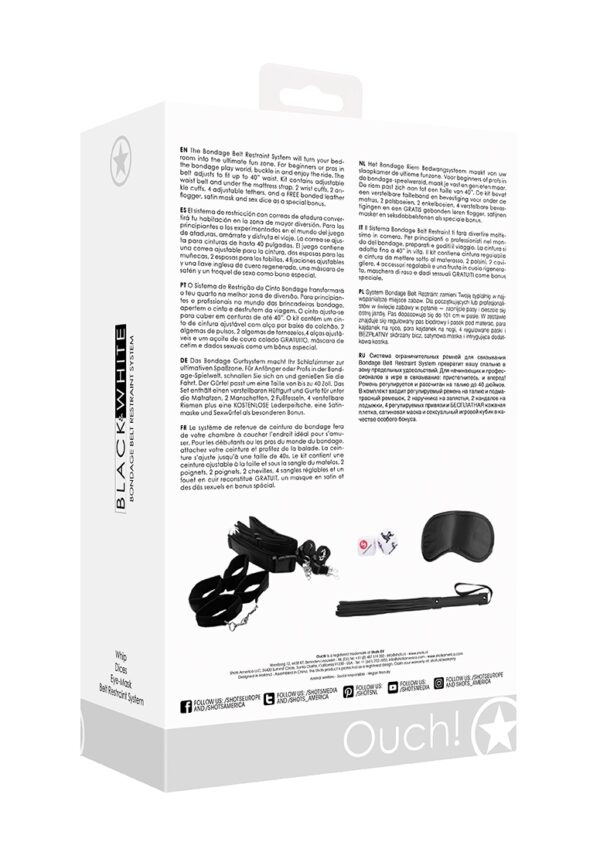 Bondage Belt Restraint SystemHet Bondage Riem Bedwangsysteem maakt van uw slaapkamer de ultieme funzone. Voor beginners of profs in de bondage-speelwereld, maak je vast en genieten maar. De riem past zich aan tot een taille van 40. De kit bevat een verstelbare tailleband en bevestiging voor onder de matras, 2 polsboeien, 2 enkelboeien, 4 verstelbare bevestigingen en een GRATIS leren flogger, satijnen masker en seksdobbelstenen als speciale bonus.
