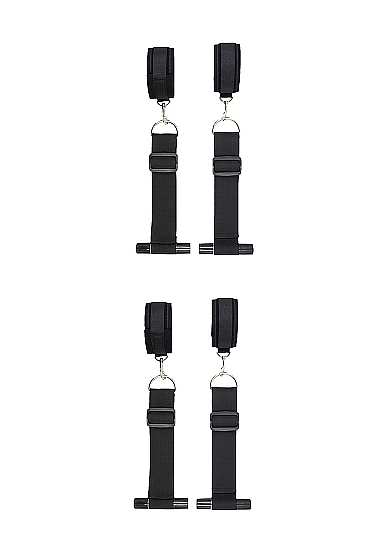 Door Restraint SetGemakkelijk te bevestigen aan elke deur om te genieten van wat bondageplezier. Plaats de 2 acryl buizen over de bovenkant van een openstaande deur, plaats de andere 2 onder de onderkant, sluit (op slot voor de veiligheid) de deur. Bind jouw partner vast en geniet. Wordt geleverd met 4 verstelbare bevestigingen, 2 handboeien en 2 enkelboeien, 4 acryl deurbuizen en een satijnen oogmasker.