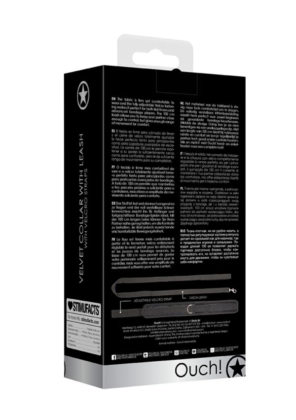 Velvet Adjustable Collar with LeashBreng je onderdanige op het rechte pad met deze fantastische, modieuze en functionele halsband en riem. Draag de halsband alleen voor een sexy onderdanige look, of bevestig de riem aan je Sub en betreed een wereld van opwindend bondagespel. De stof is stevig maar comfortabel om te dragen en de volledig verstelbare klittenbandsluiting maakt het perfect voor zowel beginners als gevorderde bondagespelers. De stevige O-ring stelt je in staat om de riem te bevestigen met behulp van de snelontgrendelingsclip voor volledige dominantie. De 120 cm lange riem stelt je in staat om je partner dichtbij genoeg te houden om te controleren, maar biedt voldoende bewegingsvrijheid voor comfort. Mix en match de Ouch! serie Handboeien en Enkelboeien voor de complete look.