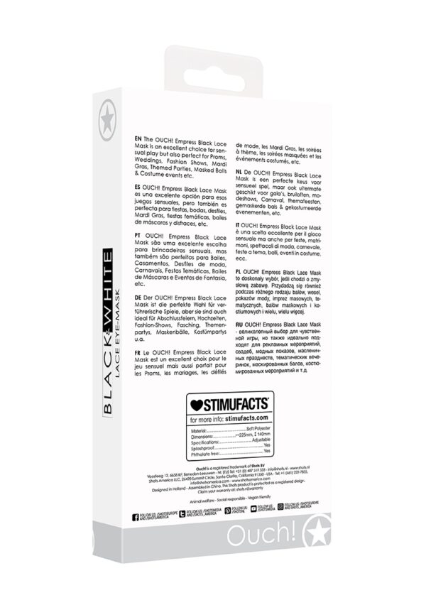 Empress – Lace MaskOUCH! presenteert een serie van 4 handgemaakte, hoogwaardige, lichtgewicht en makkelijk draagbare maskers met moderne details, geinspireerd door Venetie. Vervaardigd met lasersnijtechnologie uit het fijnste, milieuvriendelijke materiaal. Deze maskers voorzien u echt van een vleugje verleidelijke geheimzinnigheid. Twee kwaliteitslinten houden het masker op zijn plaats voor lange uren comfortabel draag- en speelgenot en zorgen ervoor dat het masker makkelijk op maat kan worden gemaakt. De OUCH! Empress Black Lace Mask is een perfecte keus voor sensueel spel, maar ook uitermate geschikt voor galas, bruiloften, modeshows, Carnaval, themafeesten, gemaskerde bals gekostumeerde evenementen, etc.