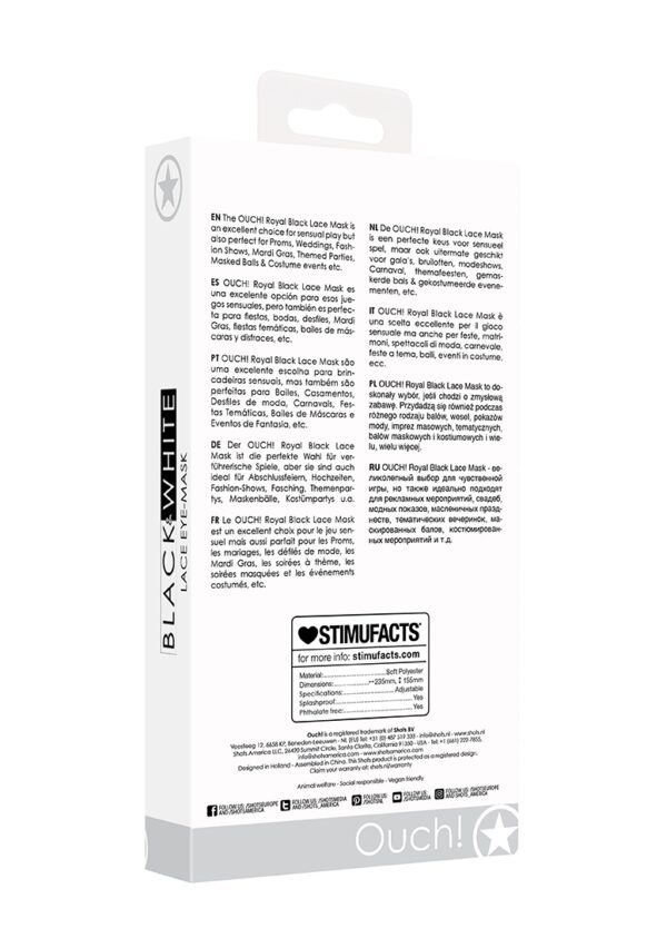 Royal – Lace MaskOUCH! presenteert een serie van 4 handgemaakte, hoogwaardige, lichtgewicht en makkelijk draagbare maskers met moderne details, geinspireerd door Venetie. Vervaardigd met lasersnijtechnologie uit het fijnste, milieuvriendelijke materiaal. Deze maskers voorzien u echt van een vleugje verleidelijke geheimzinnigheid. Twee kwaliteitslinten houden het masker op zijn plaats voor lange uren comfortabel draag- en speelgenot en zorgen ervoor dat het masker makkelijk op maat kan worden gemaakt. De OUCH! Royal Black Lace Mask is een perfecte keus voor sensueel spel, maar ook uitermate geschikt voor galas, bruiloften, modeshows, Carnaval, themafeesten, gemaskerde bals gekostumeerde evenementen, etc.