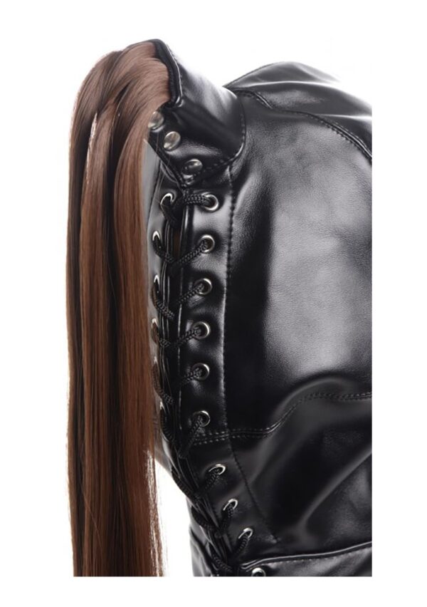 Bondage Mask PonytailVervul je fetisjfantasieen met deze zachte leren kap die het gezicht verbergt en ogen, neus en mond vrij houdt! Aan de bovenkant van de kap is een lange bruine pruik bevestigd voor een betoverend effect. Dit haar kan ook worden gebruikt voor sensatiespel op dezelfde manier waarop je een kietelveer zou gebruiken.