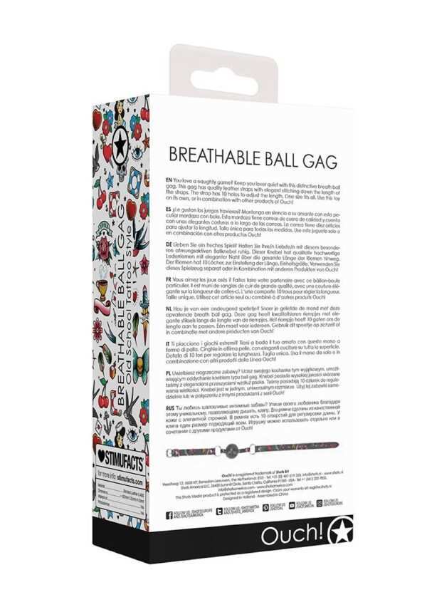 Breathable Ball GagHoud je van een ondeugend spelletje? Snoer je geliefde de mond met deze opvallende luchtdoorlatende ballgag. De gag heeft leren riempjes van hoge kwaliteit met elegante stiksels over de lengte. Deze hebben ieder 10 gaatjes om de lengte aan te passen. Gebruik deze ballgag op zichzelf of in combinatie met andere producten van Ouch!