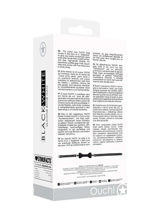 Silicone Bone GagDe gloednieuwe OUCH!- ball-gag komtin de vorm van een hondenkluif om uwerotische avonturen wat extra beet te geven!Deze mooi vervaardigde ball-gaggemaakt uit gladde, ftalaatvrije, kwalitatievesiliconen, is volledig aanpasbaar enkomt met twee riemen en een stevige klem.