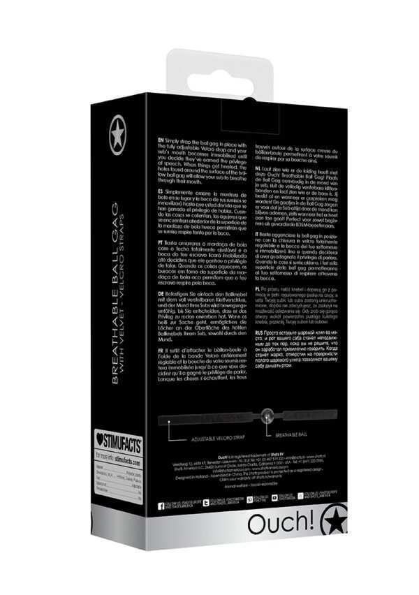 Adjustable Breathable GagNeem de controle met de Ouch! ademende Ball Gag. Maak de ball gag eenvoudig vast met de volledig verstelbare klittenbandsluiting en de mond van je sub wordt geïmmobiliseerd totdat je besluit dat ze het voorrecht van spreken hebben verdiend. Wanneer de gemoederen verhit raken, zorgen de gaten rond het oppervlak van de holle ball gag ervoor dat je sub door zijn mond en neus kan ademen. Perfect voor beginners of voor intense scènes die je Sub buiten adem kunnen laten, deze ball gag is een must voor elke goed uitgeruste gear bag of dungeon wall.