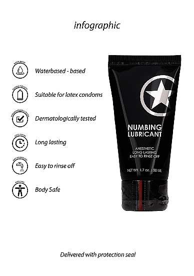 Numbing Lubricant – 2 fl oz / 50 mlNumbing lube is een verdovend glijmiddel op waterbasis. Geschikt voor gebruik met latex condooms. Dermatologisch getest. Gebruiksaanwijzing: Smeer zoveel gel als je wilt op het gewenste lichaamsdeel en herhaal zo vaak je wilt. Buiten het bereik van kleine kinderen bewaren. Koel en donker bewaren.