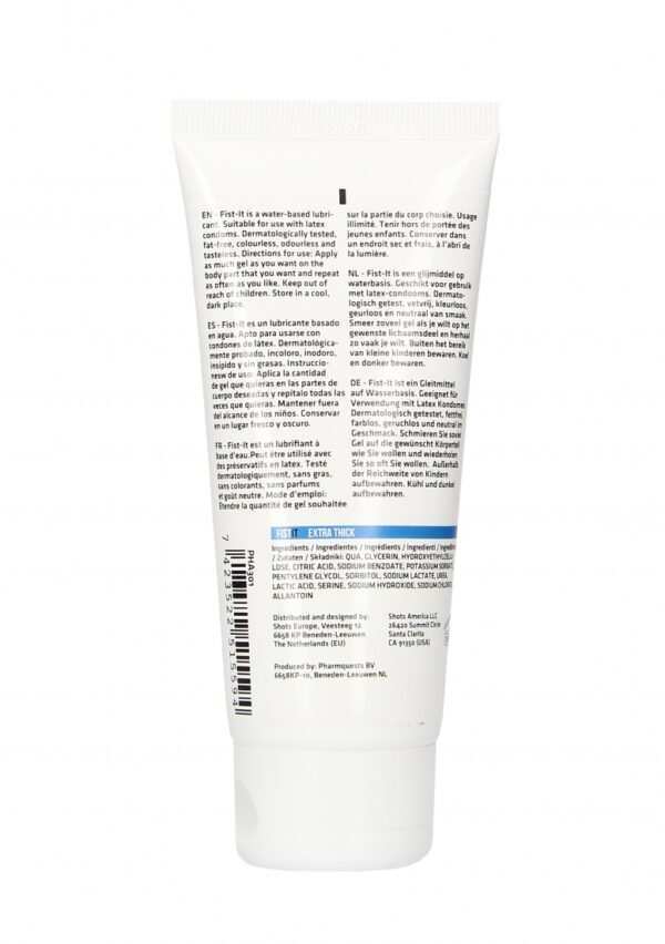 Extra Thick Lubricant – 3.4 fl oz / 100 mlFist It Professional is een glijmiddel op waterbasis. Geschikt voor gebruik met latex-condooms. Dermatologisch getest, vetvrij, kleurloos, geurloos en neutraal van smaak.Smeer zoveel gel als je wilt op het gewenste lichaamsdeel en herhaal zo vaak je wilt.Buiten het bereik van kleine kinderen bewaren. Koel en donker bewaren.