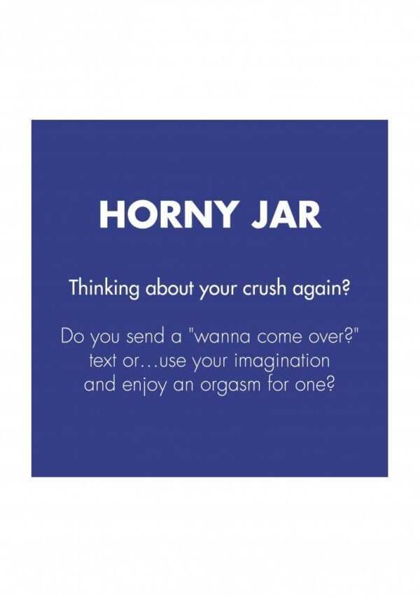 Horny Jar – Clitoral Balm – 0.28 oz / 8 grStuur je een Wil je langs? sms…of je fantasie gebruiken terwijl je geniet van een orgasme? Deze clitorisbalsem maakt je lichaam klaar om te genieten van adembenemende orgasmes. Het heeft een zijdezachte textuur dankzij de basis van kokos- en amandelolie, evenals een onmiddellijk verwarmend effect dat de bloedtoevoer naar de clitoris stimuleert en de gevoeligheid verhoogt. Schraap wat balsem uit het blikje door met je vinger over het oppervlak te vegen en breng het aan op je clitoris. Je voelt het verwarmende effect in een kwestie van seconden!Compatibel met erotische speeltjes. Duur – 30 minuten (verschilt van persoon tot persoon). Verhoogd sensatieverwarmend effect (Thermolat). Verhoogde gevoeligheid voor arginine. Belangrijke informatie: De balsem bevat amandelolie