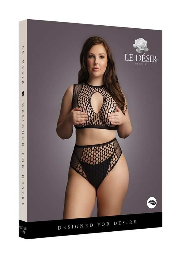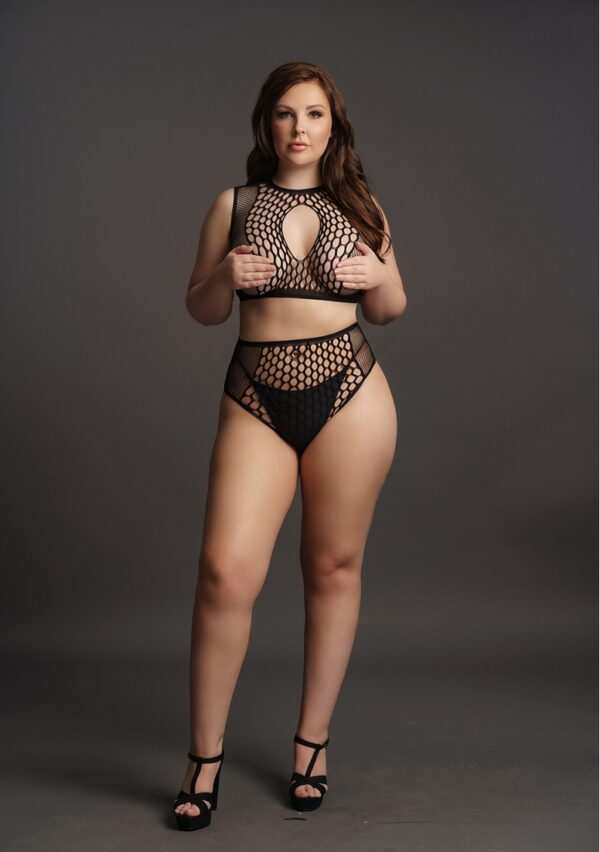 Duo Net Key-Hole Bra Set – Plus SizeTweedelige set met crop top en slip met hoge taille, een combinatie van visnet en fence net met opengewerkte details voorzijde. De zachte, superelastische stof is geschikt voor maten XL tot 4XL.String niet inbegrepen.