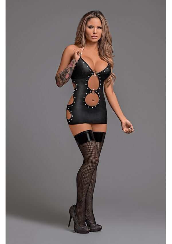 Selene – Sexy Faux Leather Mini Dress with Side Openings – L/XLDeze stijl uit de Lust Fetish-collectie van Magic Silk bestaat uit: een jurk met sleutelgat-uitsparingen, een functionele rits op de rug en een bijpassende string.