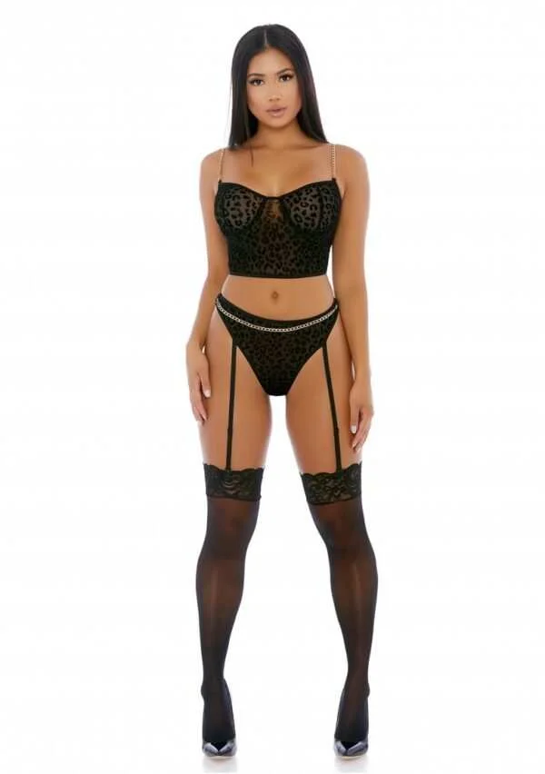 Chain Me Up – Bustier Set – MChain Me Up tweedelige bustierset van cheetah-mesh, verstelbare bandjes met gouden ketting, haak- en oogsluiting aan de achterkant en bijpassend slipje met aangehechte jarretelbandjes en afneembaar gouden kettingdetail. Dit product wordt geleverd in een doos.