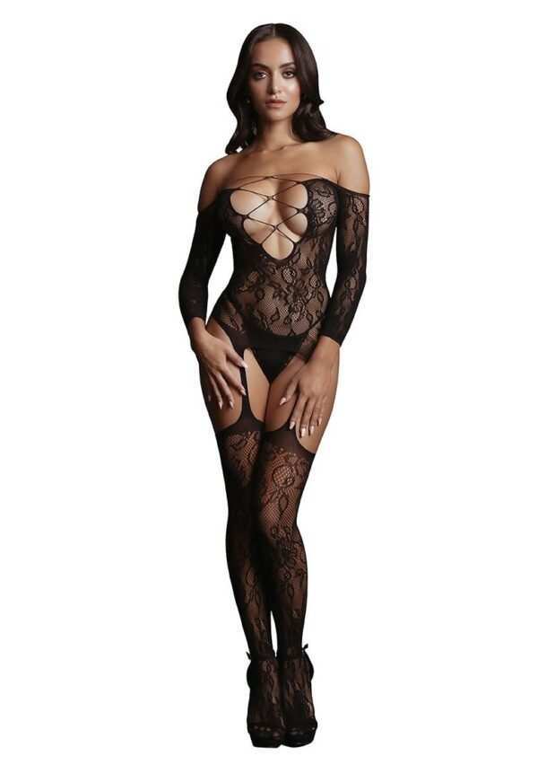 Criss Cross Neck Bodystocking – One SizeBodystocking van kantpatroon met jarretelles en diepe V-hals met gekruiste bandjes. Kan op of van de schouders worden gedragen. De zachte, superelastische stof is geschikt voor maten S tot XL.