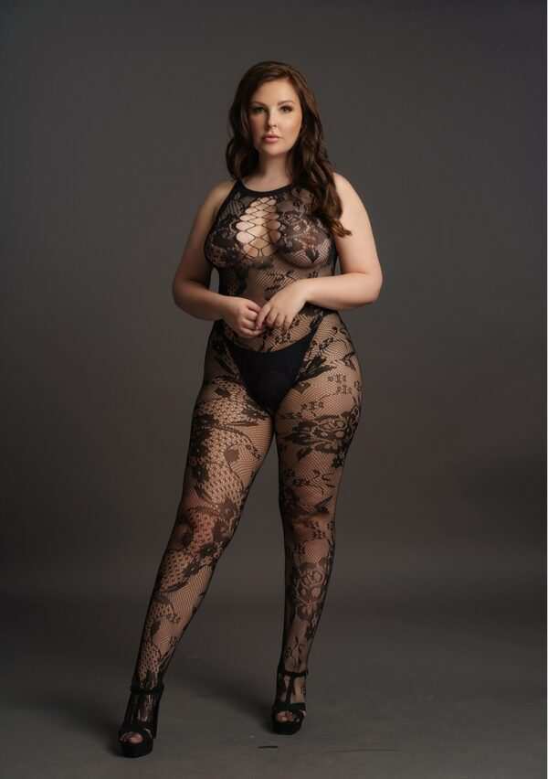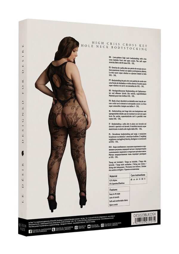 Criss Cross Neck Bodystocking – Plus SizeBodystocking met hoge hals van kantpatroon met opengewerkte details aan de voorkant en met een open kruis. De zachte, superelastische stof is geschikt voor maten XL tot 4XL.String niet inbegrepen.