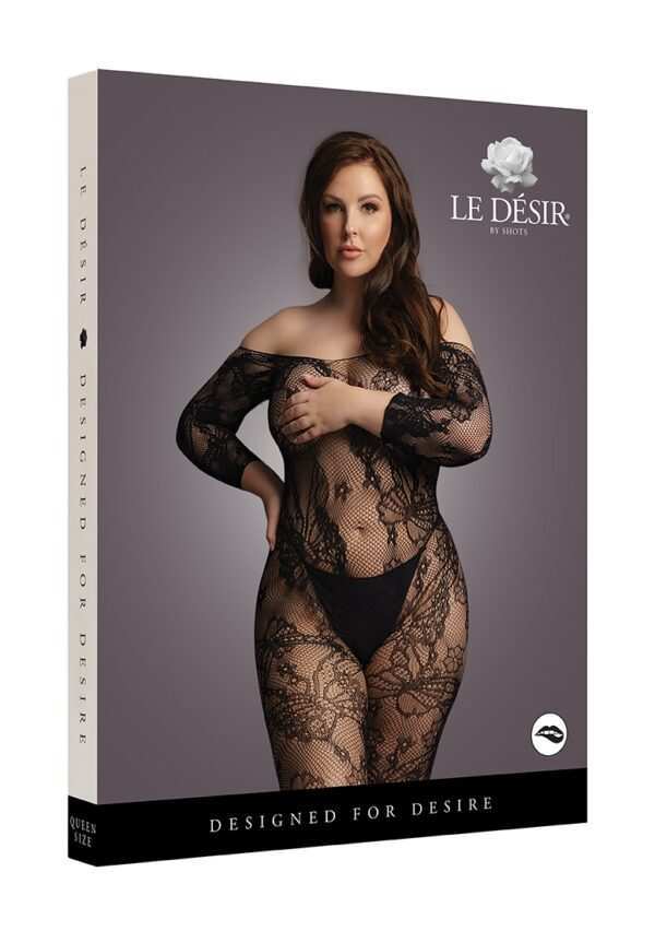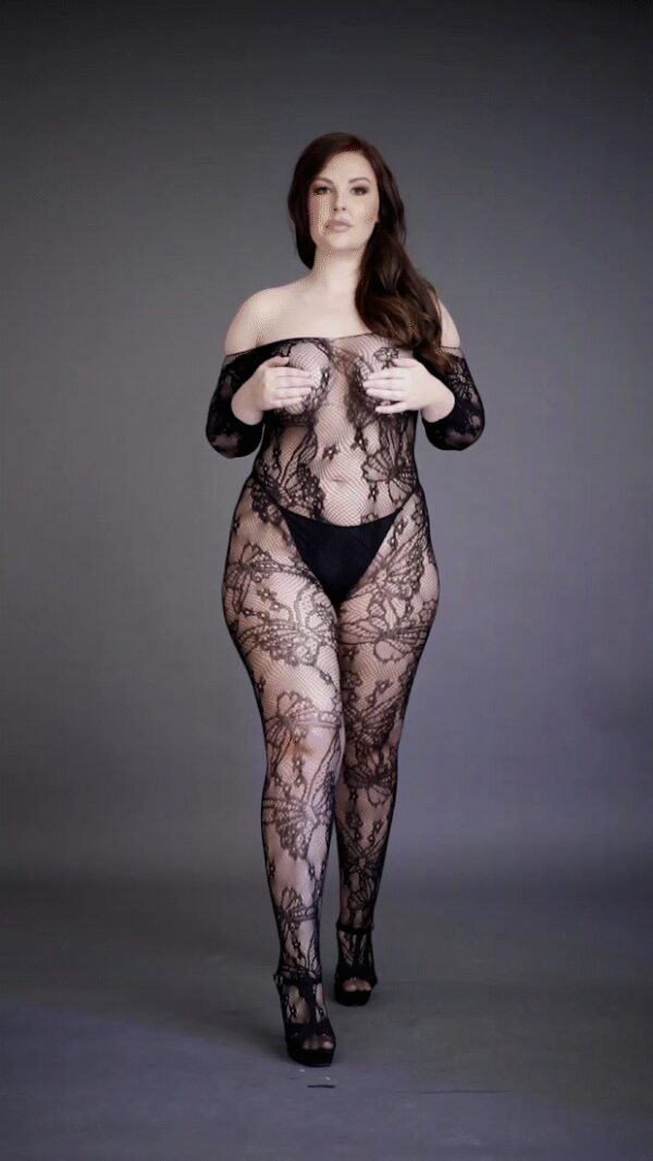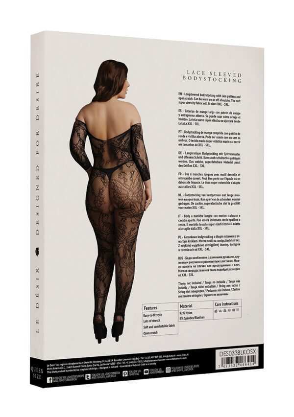 Lace Sleeved Bodystocking – Plus SizeBodystocking van kantpatroon met lange mouwen en open kruis. Kan op of van de schouders worden gedragen. De zachte, superelastische stof is geschikt voor maten XL tot 4XL.String niet inbegrepen.