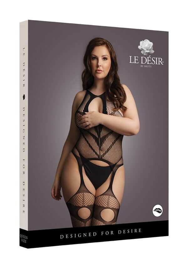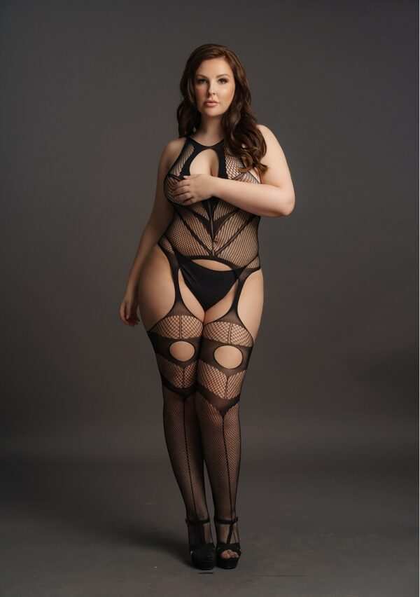 Suspender Bodystocking – Plus SizeBodystocking met hoge hals van visnet, jarretelles en kousen met naad. Het visnet wordt aangevuld met een contrasterend opaque patroon en sexy opengewerkte details. De zachte, superelastische stof is geschikt voor maten XL tot 4XL.String niet inbegrepen.