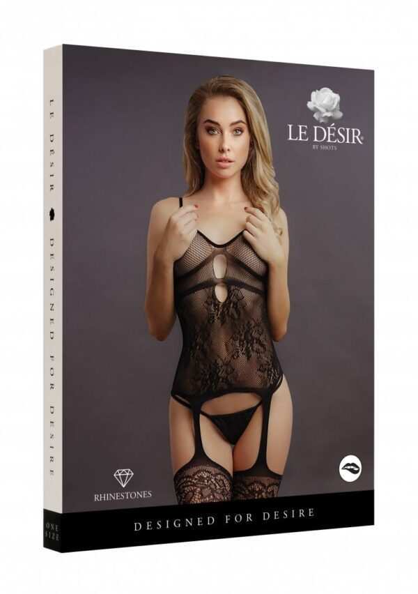 Suspender Rhinestone Bodystocking – One SizeDeze sexy jarretel bodystocking met diepe V-hals en spaghettibandjes straalt sexappeal uit. Met een bovenstuk van visnet materiaal, een lijfje in kantpatroon en sprankelende kousen, heb je een complete look. De kousen zijn voorzien van strass steentjes. De zachte, rekbare stof zorgt voor een comfortabele en gemakkelijke pasvorm. String niet inbegrepen.