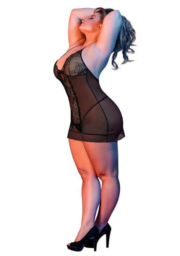 Nightgown and G-String Set – 2X – BlackDeze stijl uit de Exposed by Magic Silk-collectie bestaat uit: een chemise met zachte halterbandjes die om de nek worden gewikkeld om te sluiten, zachte kanten cups, een sleutelgataccent aan de voorkant, een geplooide mesh-zoom en een klassieke mesh-string.