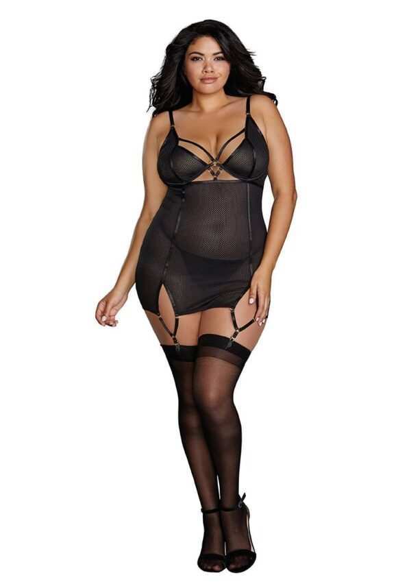 Fishnet Texture Power Mesh Garter Slip – 1XVisnet textuur power mesh kousenband slip. Beugel cups met elastische bandjes en gouden ring details. Bandjes elastische rug met haak-oog sluiting en verstelbare schouderbandjes. Sleutelgat zoom detail met elastische bandjes en gouden ringen, met bevestigde vaste lengte kousenbanden. Bijpassende G-string inbegrepen.