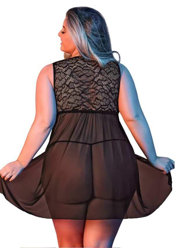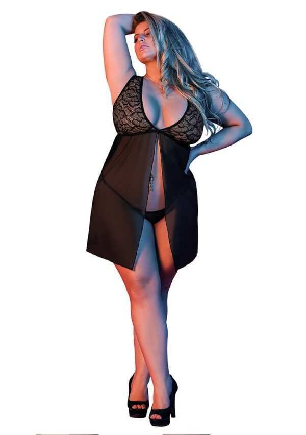 Babydoll with Open Back and G-String Set – 2X – BlackDeze stijl uit de Exposed by Magic Silk-collectie bestaat uit: een babydoll met zachte kanten bh-cups, een tanktop van kant aan de achterkant, een openvallende voorkant, een lange bedekking tot over de dijen en een klassieke mesh string.
