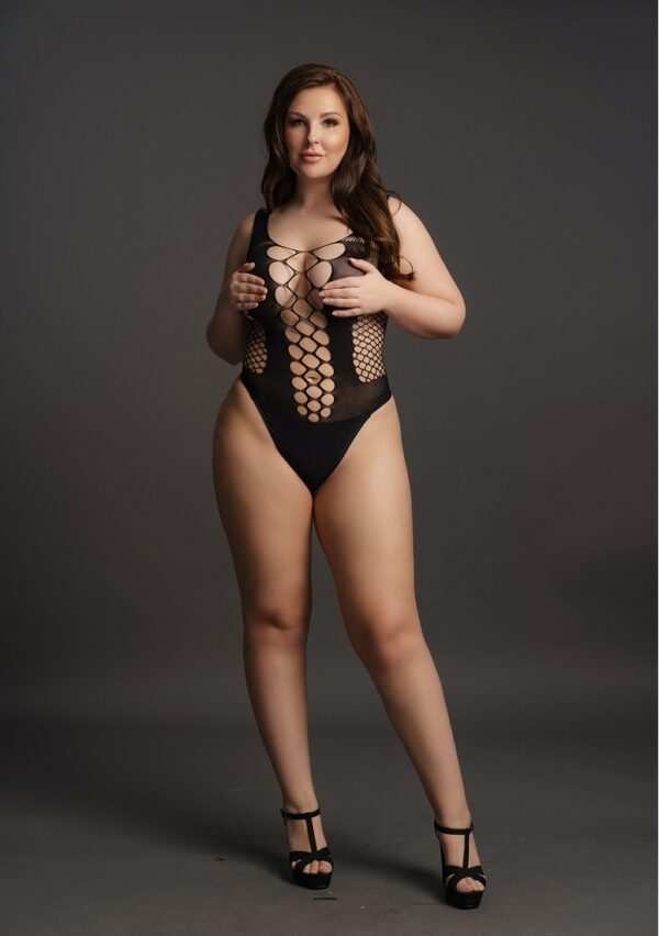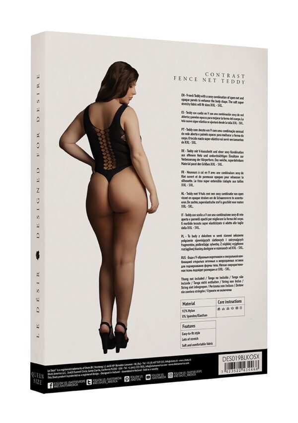 Contrast Fence Net Teddy – Plus SizeTeddy met V-hals met een sexy combinatie van open visnet en opaque stroken om de lichaamsvorm te accentueren. De zachte, superelastische stof is geschikt voor maten XL tot 4XL.String niet inbegrepen.
