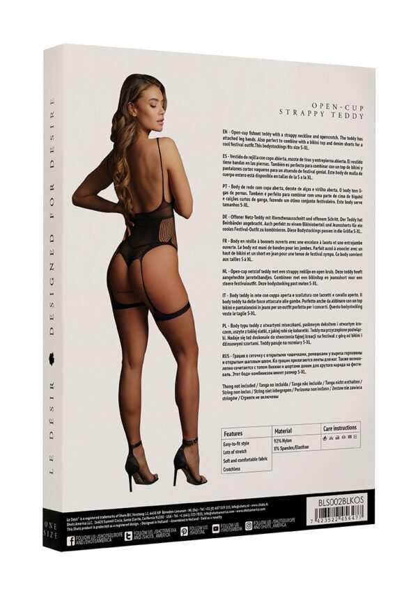 Open-Cup Strappy Teddy – One SizeOpen-cup netstof teddy met een strappy neklijn en open kruis. Deze teddy heeft aangehechte jarretelbandjes. Combineer met een bikinitop en jeansshort voor een stoere festivaloutfit. Deze bodystocking past maten S-XL. String niet inbegrepen.String niet inbegrepen.