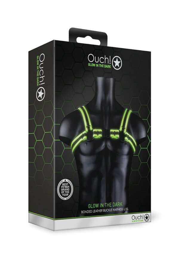 Buckle Harness – Glow in the Dark – L/XLOuch! Glow in the Dark, de toekomst van bondage is hier. Het design heeft het autentiek bondage uiterlijk, maar brengt licht in het duister door zijn fluoresecrende groene details waardoor alles een feest wordt. Riem jezelf vast in dit harnas en accentueer jou mannelijke vorm. Het harnas is verstelbaar zodat het bij elk lichaamstype past. Ouch! Glow-In-The-Dark producten moeten worden geactiveerd met het zonlicht voordat je er in het donker van kunt genieten.
