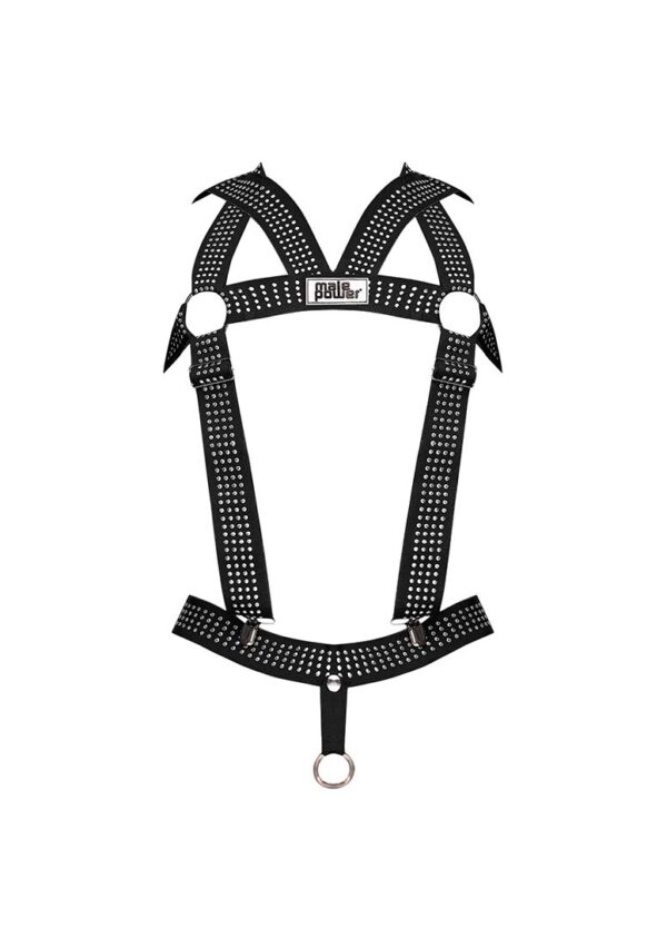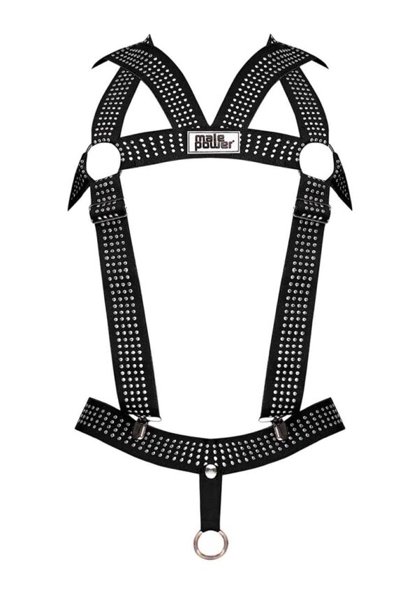 Elastic Harness with Studs – One Size – BlackDeze stijl komt uit de Elastic Harness-collectie van Male Power en bestaat uit: een harnas met banden die zijn afgezet met metalen studs, verstelbare metalen clips en een afneembare tailleband met een afneembare siliconen rubberen cockring.