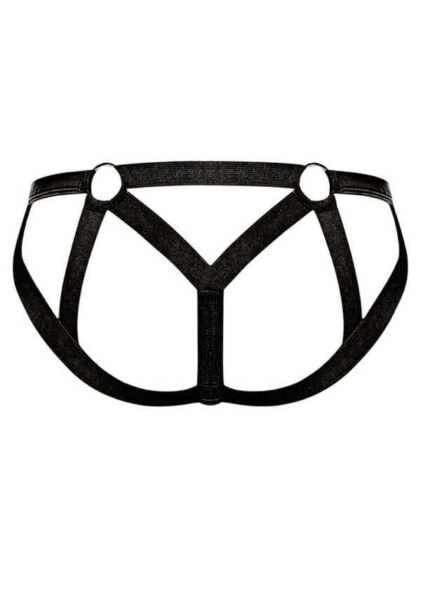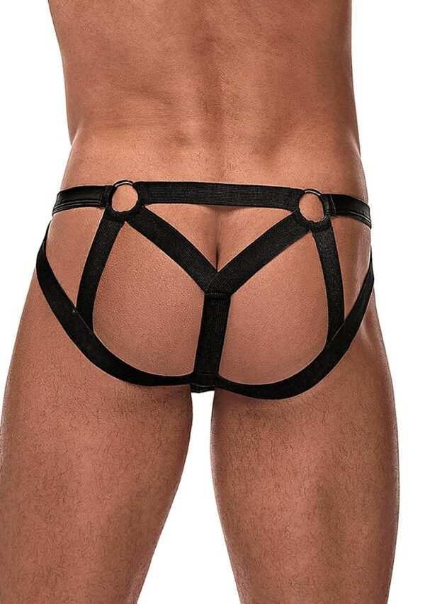 Strappy Ring Jock – S/M – BlackDeze stijl uit de Cage Matte-collectie van Male Power bestaat uit: een ringjock met bandjes, met aan de achterkant bandjes die zijn verbonden door vernikkelde ringen en een ondersteunend, comfortabel zakje