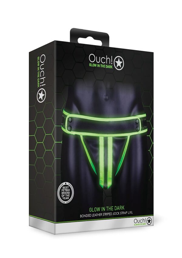Striped Jockstrap – Glow in the Dark – L/XLOuch! Glow in the Dark, de toekomst van bondage is hier. Het design heeft het autentiek bondage uiterlijk, maar brengt licht in het duister door zijn fluoresecrende groene details waardoor alles een feest wordt. Deze jockstrap accentueert gegarandeerd alle juiste plekken. Deze mooi ontwerpen jockstrap heeft een elastische band voor een perfecte pasvorm. Ouch! Glow-In-The-Dark producten moeten worden geactiveerd met het zonlicht voordat je er in het donker van kunt genieten.