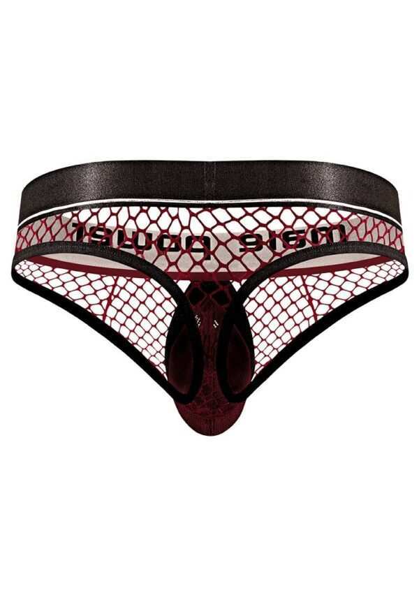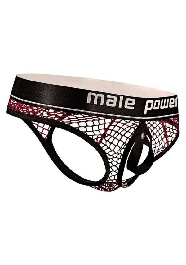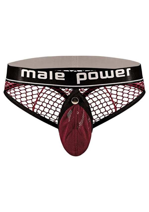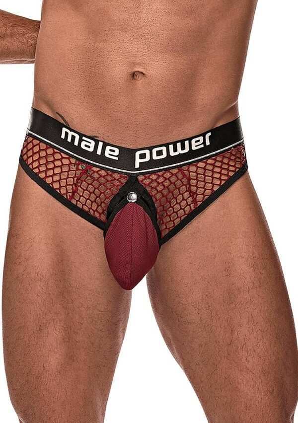 Cock Ring Thong – L/XL – BurgundyDeze stijl komt uit de Cock Pit Net-collectie van Male Power en bestaat uit: een cockringstring met een afneembaar zakje dat los kan worden geklikt en een zachte elastische C-ring laat zien, een klassieke string aan de achterkant, zachte elastische afwerking en een satijnen tailleband met merklogo.