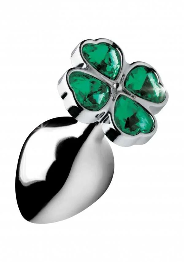 Lucky Clover Gem – Butt Plug – MediumLaat die kont geluk hebben met deze medium metalen anaal plug met een klavertje-sieraad aan de basis! Stop deze geluksbrenger in je pot-o-gold om het comfortabele gewicht in je lichaam te waarderen, dankzij het nikkelvrije materiaal van aluminiumlegering. Geweldig voor temperatuurspel, je kunt het opwarmen of afkoelen in water voordat je het inbrengt. De aantrekkelijke vorm van de basis zal je partner verrassen als je voorover buigt. Schud die klaver! Gebruik met een smeermiddel naar keuze en reinig na gebruik met milde zeep of speelgoedreiniger.