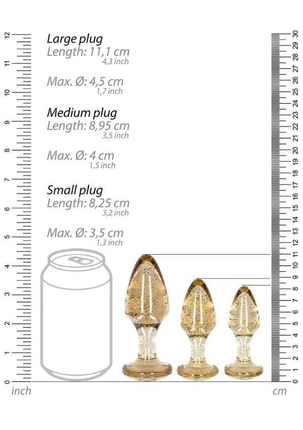 Acrylic Butt Plug SetAls opwindende anale seks jouw ding is dan zal deze sprankelende buttplug set je zeker niet teleurstellen! De ergonomisch gevormde set komt in drie verschillende maten en is ontworpen met comfort en ultiem genot als belangrijkste factoren. Ontspan en geniet van deze gemakkelijk inbrengbare pluggen alleen of samen met je partner! Deze glinsterende set heeft alles wat je nodig hebt voor uren aan anaal plezier. Begin met het kleine formaat en neem de volgende stap als je er klaar voor bent! De pluggen hebben een taps toelopende punt voor een gemakkelijke inbreng en de voet is wijd uitlopend voor volledig comfort en veiligheid. Deze schitterende buttplug set zal zelfs je meest intense climax nog eens net dat beetje extra geven!