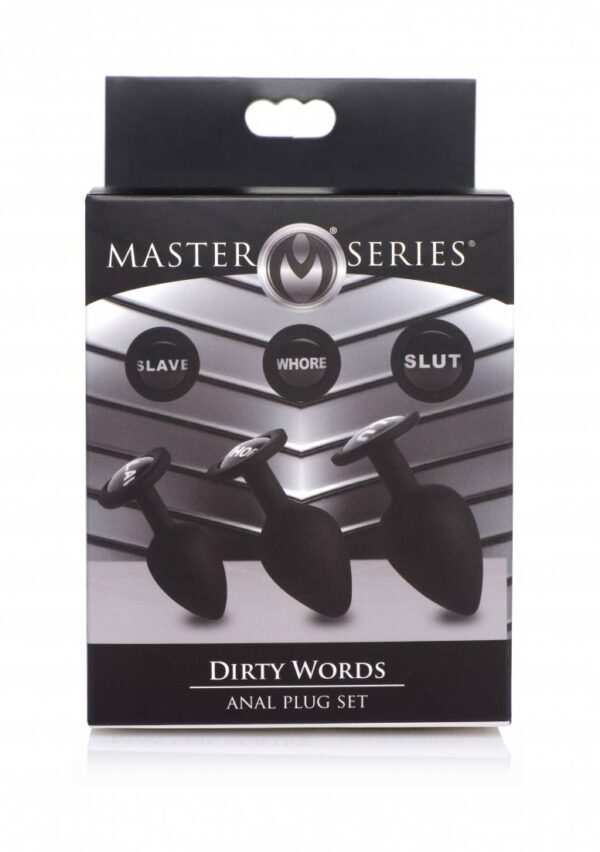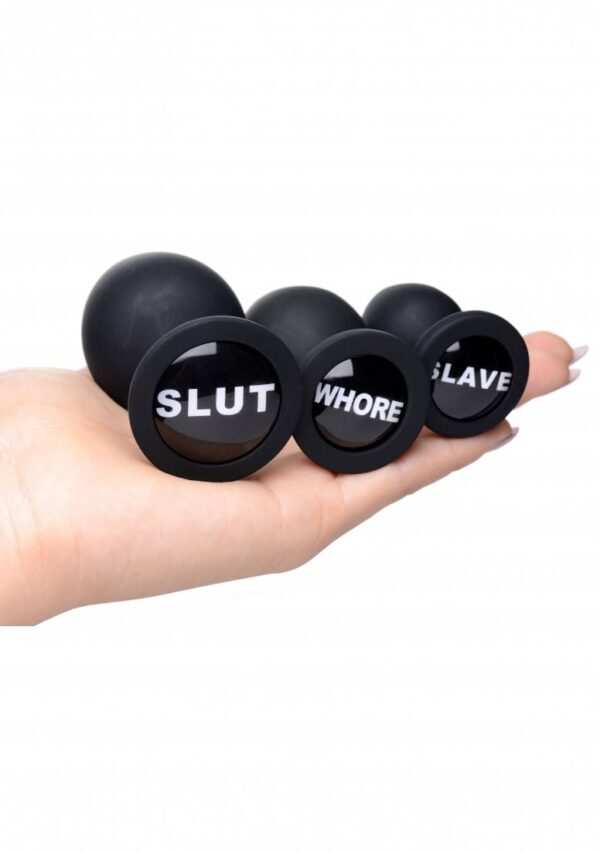 Dirty Words – Silicone Anal Plug SetDe Dirty Words Anaal Plug set bevat 3 verschillende maten premium siliconen booty accessoires om dat gaatje te trainen! Ga van backdoor beginner tot gevorderde anale liefhebber. Elke plug heeft een ondeugende naam voor je kont – of je speelgoedkont om te laten zien: slaaf, hoer en slet! Met welke zal dat gat worden gebrandmerkt? De taps toelopende vorm en het gladde materiaal maken het inbrengen gemakkelijker, terwijl de smalle stelen ze comfortabel maken voor langdurig gebruik. De hoogwaardige siliconen zijn niet-poreus en ftalaatvrij, maar niet compatibel met siliconensmeermiddelen. Reinig met milde zeep of speelgoedreiniger.