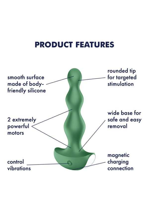 Lolli Plug 2 – Classic Vibrator – GreenTijd om vrolijk te worden met de LOLLI-collectie! De LOLLI PLUG 1, voorzien van 3 oplopende ruitvormige kralen, en de LOLLI PLUG 2, met 3 oplopende afgeronde kralen, vullen, strelen en drukken beide perfect al je anale plezierpunten. Deze sensuele pluggen zijn geschikt voor beginners en meer gevorderde spelers en bieden twee sterke en strategisch geplaatste motoren en zijn gemaakt van zacht, lichaamsvriendelijk siliconen. De prikkelende vibraties in de kralen bieden een unieke rollende vibratie die je zal prikkelen en verleiden tot verhoogde staten van gelukzaligheid. De LOLLI PLUG 1 is verkrijgbaar in twee unieke kleuropties: donkerblauw en bes. De LOLLI PLUG 2 is verkrijgbaar in twee uitnodigende kleuren: koel grijs en warm groen. Bestel de jouwe vandaag en maak je klaar om je volgende plezierbondgenoot te ontmoeten.