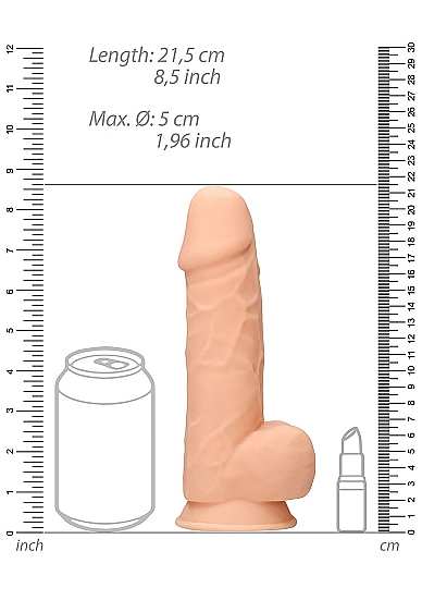 Silicone Dildo with Balls – 9 / 21,6 cmDit model met ballen is 21,6 cm lang, inclusief de zuignap, heft een penetreerbare lengte van 15,8 cm en een omvang van 5 cm. Ervaar het eersteklas gevoel van siliconehuid aan de buitenkant, gecombineerd met de revolutionaire, dubbeldichte vulling aan de binnenkant. Een hogere factor flexibiliteit en verbeterde dichtheid, geven deze dildo een superrealistische uitstraling, waardoor u hem kunt buigen en vormen al naar gelang uw wensen. Indien verwarmd (max. 30 seconden in de magnetron 2 minuten in kokend water), zorgen de thermo-reactieve eigenschappen ervoor dat het speeltje zachter en plooibaarder wordt. Aan de andere kant, als het speeltje wordt gekoeld in de koelkast, wordt het harder met diverse genotsmogelijkheden voor gebruik. Dit REALROCK ULTRA-model is ontworpen met realistische ballen voor een verbeterde, levensechte ervaring. Alle REALROCK ULTRA DILDO’S zijn voorzien van een stevige zuignap, zodat u ze op vrijwel elke vlak oppervlak kunt vastzetten. Leverbaar in drie spannende kleuren: vleeskleur, bruin en zwart.