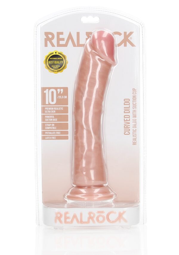 Curved Realistic Dildo with Suction Cup – 10 / 25,5 cmRealRock is ontworpen voor jouw ultieme genot. Een stevige en zacht aanvoelende dildo, met een natuurlijk uiterlijk en precies de juiste maat. Dit alles in combinatie met de realistische aders op de schacht voor extra stimulatie van binnen, zorgen ervoor dat je deze dildo niet snel zult vergeten in je nachtkastje. Deze realistische dildo is licht gebogen, wat hem ideaal maakt voor g-spot stimulatie. Geniet van dit model van binnen en van buiten! Door details als de kleuren en goedgevormde eikel is het gebruik van deze dildo levensecht. De zuignap maakt stevig handsfree gebruik mogelijk (op een gladde ondergrond) en biedt tevens de mogelijkheid om deze RealRock in een harnas te gebruiken. Met al deze opties zul je een explosief orgasme hebben dat aan niets zal ontbreken.