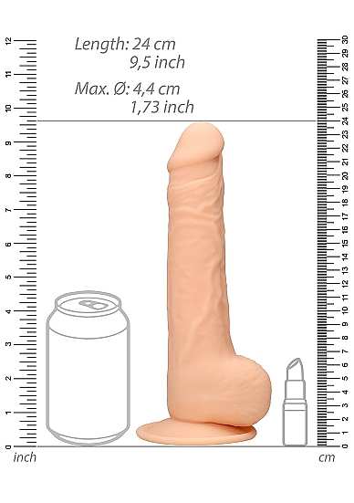 Silicone Dildo with Balls – 9 / 24 cmDit model met ballen is 24 cm lang, inclusief de zuignap, heft een penetreerbare lengte van 17 cm en een omvang van 4,4 cm. Ervaar het eersteklas gevoel van siliconehuid aan de buitenkant, gecombineerd met de revolutionaire, dubbeldichte vulling aan de binnenkant. Een hogere factor flexibiliteit en verbeterde dichtheid, geven deze dildo een superrealistische uitstraling, waardoor u hem kunt buigen en vormen al naar gelang uw wensen. Indien verwarmd (max. 30 seconden in de magnetron 2 minuten in kokend water), zorgen de thermo-reactieve eigenschappen ervoor dat het speeltje zachter en plooibaarder wordt. Aan de andere kant, als het speeltje wordt gekoeld in de koelkast, wordt het harder met diverse genotsmogelijkheden voor gebruik. Dit REALROCK ULTRA-model is ontworpen met realistische ballen voor een verbeterde, levensechte ervaring. Alle REALROCK ULTRA DILDO’S zijn voorzien van een stevige zuignap, zodat u ze op vrijwel elke vlak oppervlak kunt vastzetten. Leverbaar in drie spannende kleuren: vleeskleur, bruin en zwart.