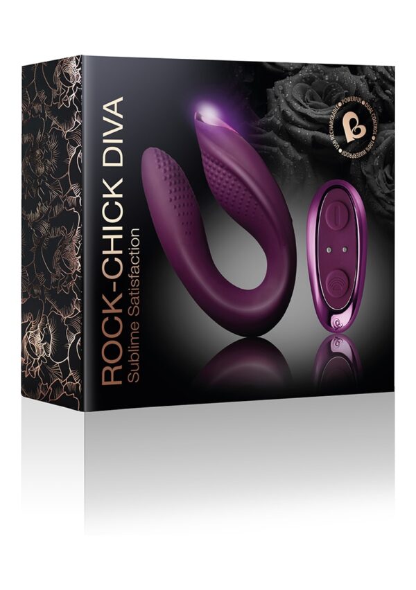 | Omschrijving Beslist | Rock-Chick Diva – Purple – Timeless and instantly recognisable Rock Chick Diva s Iconic lines and imperssive power embraces unrivalled performanceto take you to another level of ograsmic passion. Expertly fine-tuned to fire up, Diva has been crafted to heighten Clitoral andG spot stimulation giving you the perfect blended, ermote controlled and handsfree orgasm. Powerful, dual independentmotors sit within the ergonomic stimulation points whilst the flexible velvet touch siclione niches firmly to your body as yourock yourself into divine climax. Enjoy Diva on your own or hand over the power control to your partner to decide what yourpassion will be. With so much versatility and powe,r it is no surprise that Diva will be your ultimate encoer. |