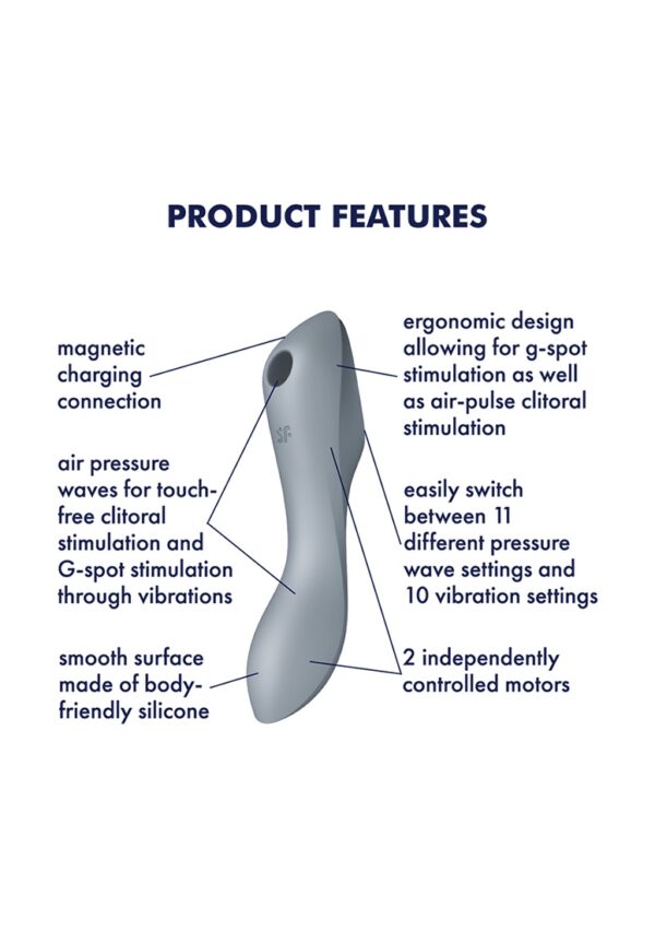 Curvy Trinity 3 – Insertable Air Pulse Vibrator – BluegreyBen je besluiteloos? De Curvy Trinity 3 functioneert als Air pulse stimulator, oplegvibrator en G-spot vibrator in een! Gebruik elke functiescheiding en gemakkelijk. Met een gladde en smaller wordende schacht en een lichte rand is dit product voor zowel beginners als kenners. Navigeer eenvoudig door drie verschillende productfuncties met het gemak dat u slechts een product nodig hebt. Bedien de 3 motoren met behulp van het intuitieve bedieningspaneel, met 11 drukgolfintensiteiten en 12 vibratieprogramma’s die onafhankelijk van elkaar kunnen worden bediend. De Curvy Trinity 3 is gemaakt van lichaamsveilige siliconen, is oplaadbaar en waterdicht (IPX7). Koop iets dat alles kan!