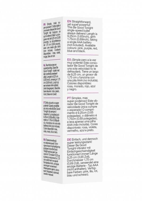 1 Speed Bullet – PurpleRechtdoorzee en superkrachtig. Deze Be Good Tonight – bullet met een snelheid presteert altijd. Lengte is 9,3 cm (3,7 inch), omvang is 1,8cm (0,7 inch). Loopt op een enkele AAA-batterij(niet inbegrepen). Beschikbare kleuren: roze, paars,rood, blauw en zwart.