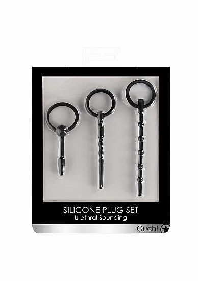 Urethral Sounding Plug SetDe OUCH! Urethral sounding Plug Set, bestaat uit 3 ftalaatvrije, soepele silicone dilators van hoge kwaliteit, die stapsgewijs gebruikt kunnen worden voor urethraal spel. Deze kan gebruikt worden om een immense stimulatie te creeren en om geleidelijk nieuwe genotssferen te verkennen. Deze eenvoudige dilators met textuur kunnen zorgen voor ongelooflijke sensaties en helpen met het opbouwen van sterke erecties en krachtige orgasmes. Ze zijn ideaal voor BDSM-spel en in het bijzonder om medische spelervaringen te creeren. Elke dilator heeft een andere maat en textuur voor extra sensatie en een soepele overgang van de ene maat naar de andere. Zie specificaties voor exacte maten op de doos. Je kunt de plug makkelijk verwijderen door je vinger door de ring te halen en te trekken. Waarschuwing: Als er niet zorgvouldig mee wordt omgegaan, kan het leiden tot irritatie, scheuren van de urethra, of tot een urinaire kanaalinfectie.