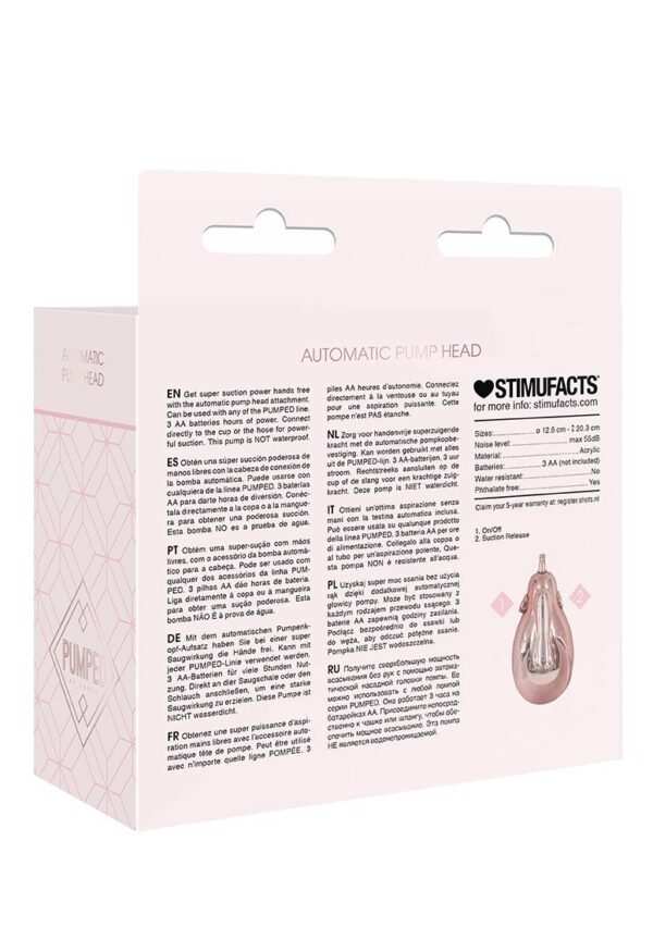 Automatic Pump HeadKrijg super zuigkracht handsfree met de automatische pompkopbevestiging. Kan worden gebruikt met alle PUMPED-lijnen. 3 AA-batterijen urenlang vermogen. Sluit direct aan op de beker of de slang voor krachtige zuigkracht. Deze pomp is NIET waterdicht. WAARSCHUWING: Lees de producthandleiding voordat u een vacuümpomp gebruikt. Stop onmiddellijk met het gebruik van het apparaat als u pijn of ongemak ervaart.