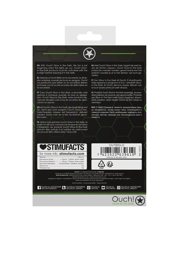 Cockring Set – Glow in the Dark – 2 PiecesOuch! Glow in the Dark, de toekomst van bondage is hier. Het design heeft het autentiek bondage uiterlijk, maar brengt licht in het duister door zijn fluoresecrende groene details waardoor alles een feest wordt. Deze penisring bevat twee ringen die comfortabel en rekbaar zijn. De ringen verbeteren je seksuele daden en brengen vele mogelijkheden met zich mee door de flexibiliteit. Ouch! Glow-In-The-Dark producten moeten worden geactiveerd met het zonlicht voordat je er in het donker van kunt genieten.