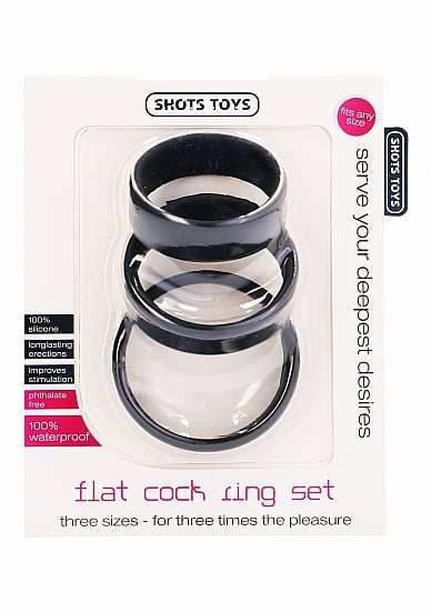 Flat Cockring SetDeze cock ring verbetert seksuele prestaties. De ring wordt gedragen aan de basis van de penis en kan worden gebruikt met een condoom. Voor zijn en haar plezier en voor langere en betere erecties. 3 verschillende maten, medium, large en extra large.